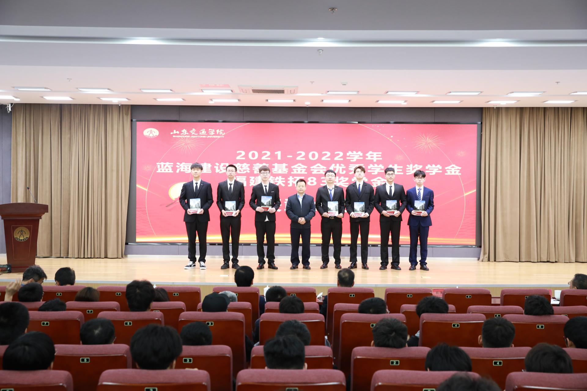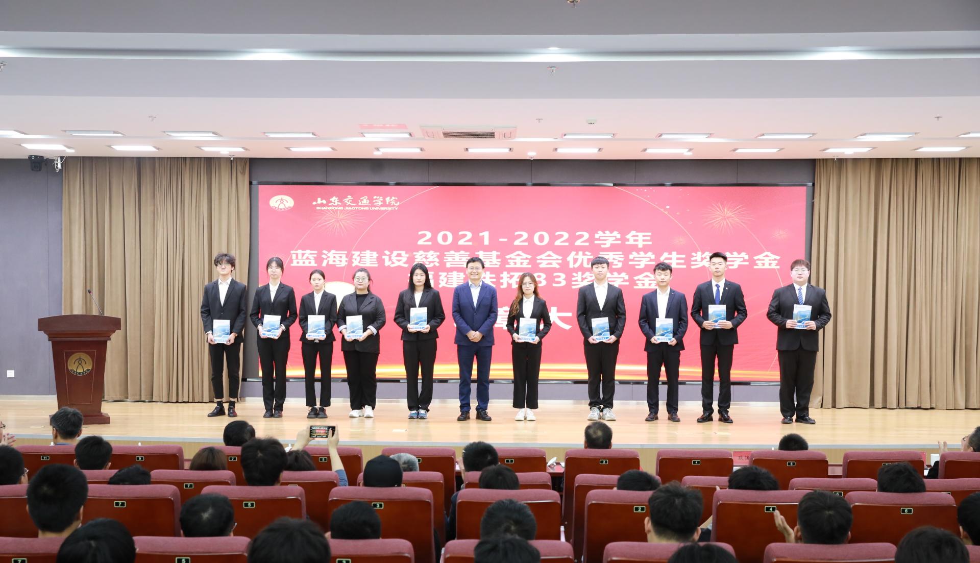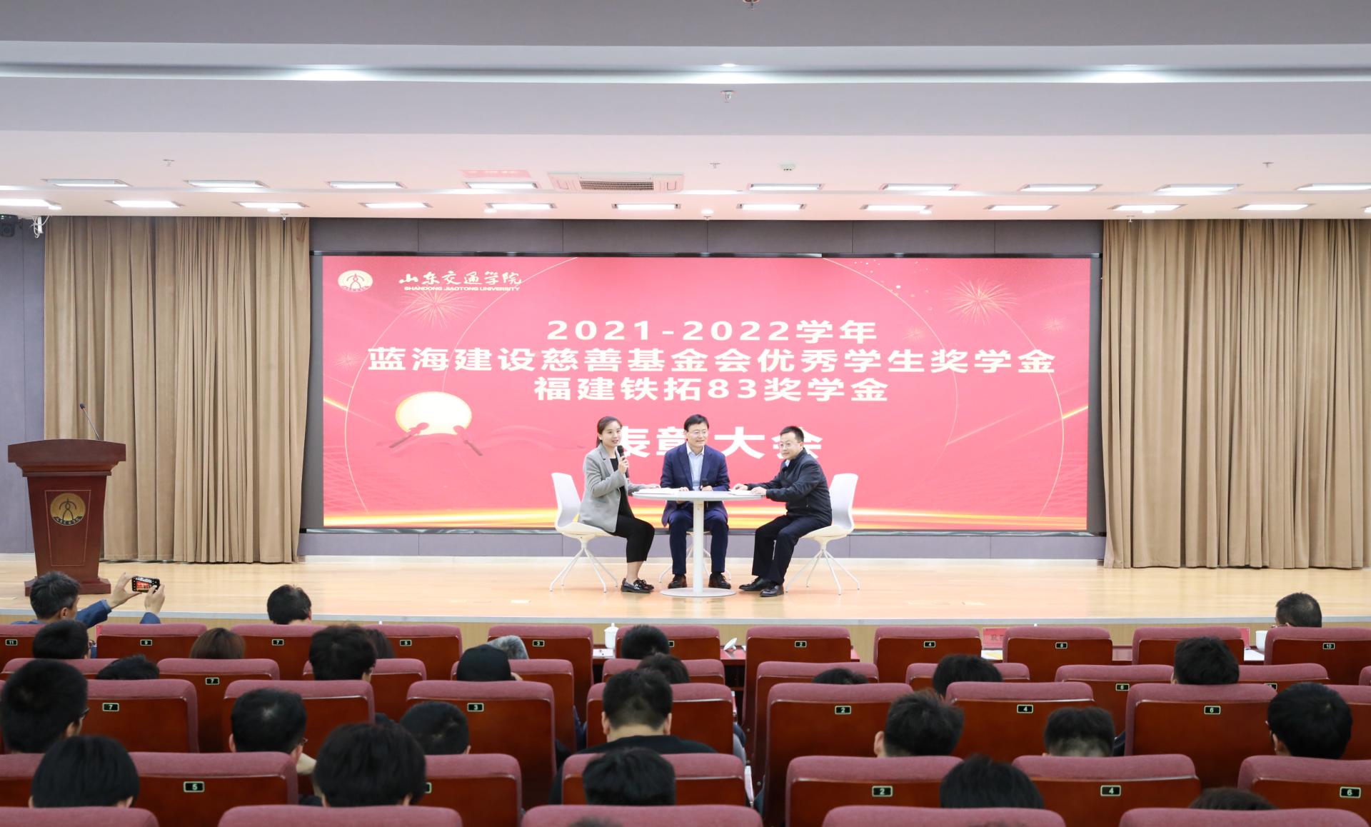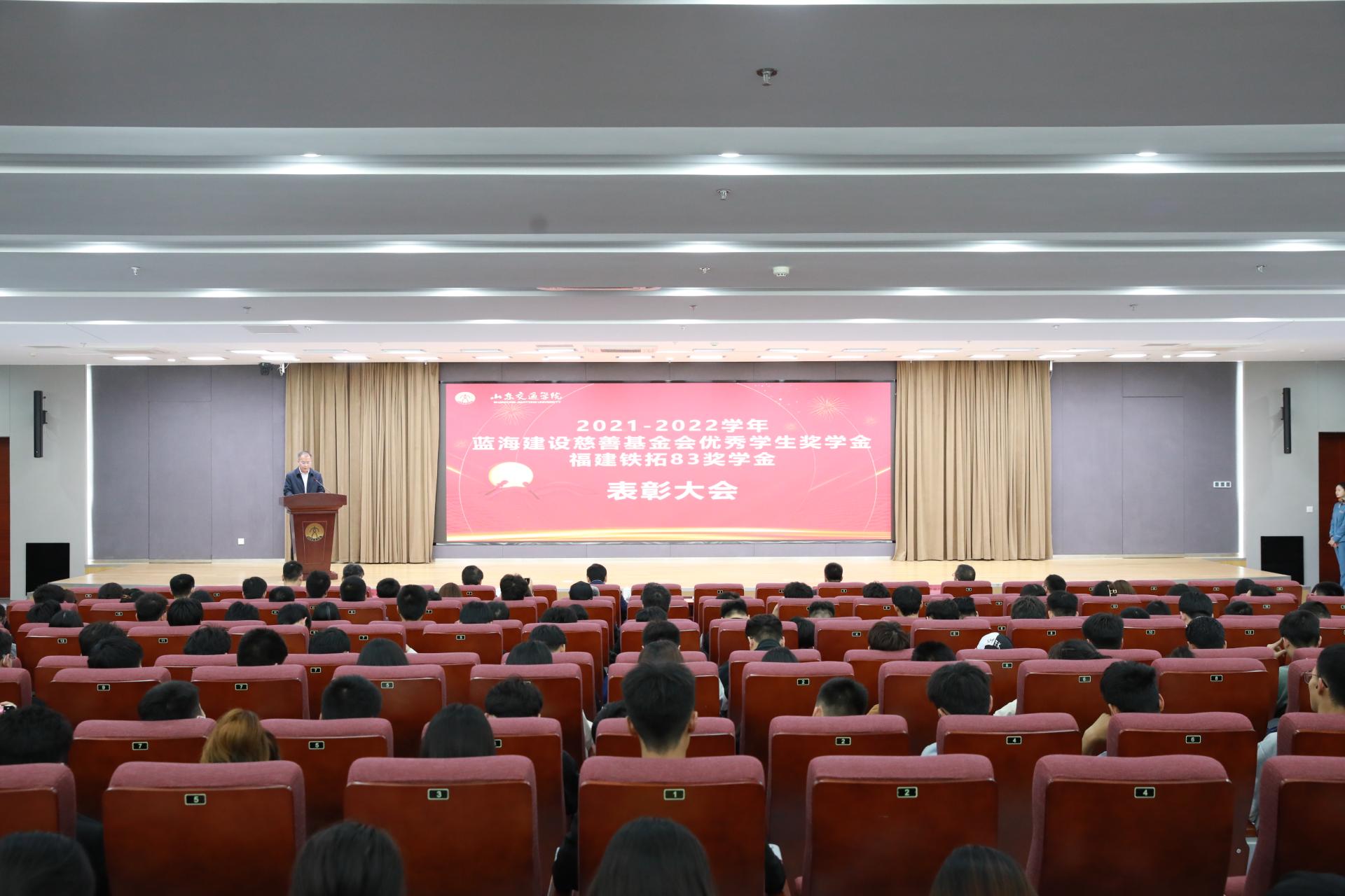 4月14日上午,学校在明德楼报告厅举行2021-2022学年“蓝海建设慈善基金会优秀学生奖学金”“福建铁拓83奖学金”表彰大会。学校党委副书记李贞涛,安徽省交通运输厅安全处处长、安徽校友会常务副会长王本维,蓝海奖学金设立者、蓝海建设集团有限公司董事长刘卫峰,福建省铁拓机械股份有限公司东部大区总经理耿强强出席。
