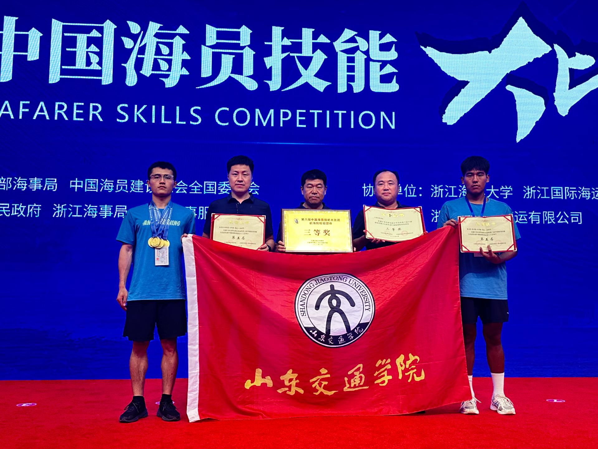 6月26日至29日,第六届中国海员技能大比武在浙江舟山举行。我校代表队“蛟龙队”以总分第七名获团体三等奖。