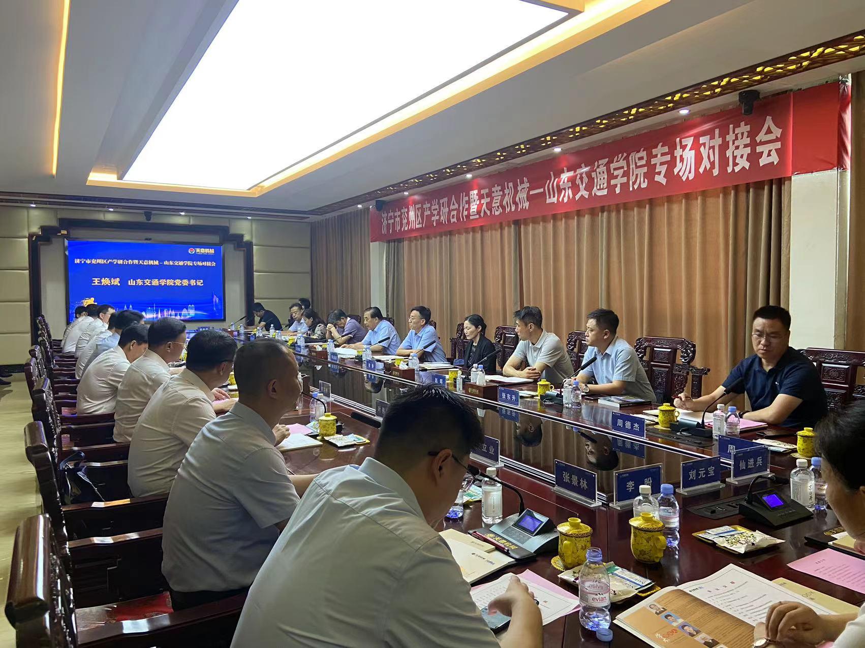 7月4日上午,济宁市兖州区产学研合作暨天意机械—山东交通学院专场对接会举行。学校党委书记王焕斌,党委委员、副院长来逢波;济宁市委组织部副部长、公务员局局长杨志国,济宁市科学技术局党组书记、局长龚标;兖州区委书记王庆,区委副书记苏振,区政府副区长展召爽;山东天意机械股份有限公司董事长刘洪彬出席活动。